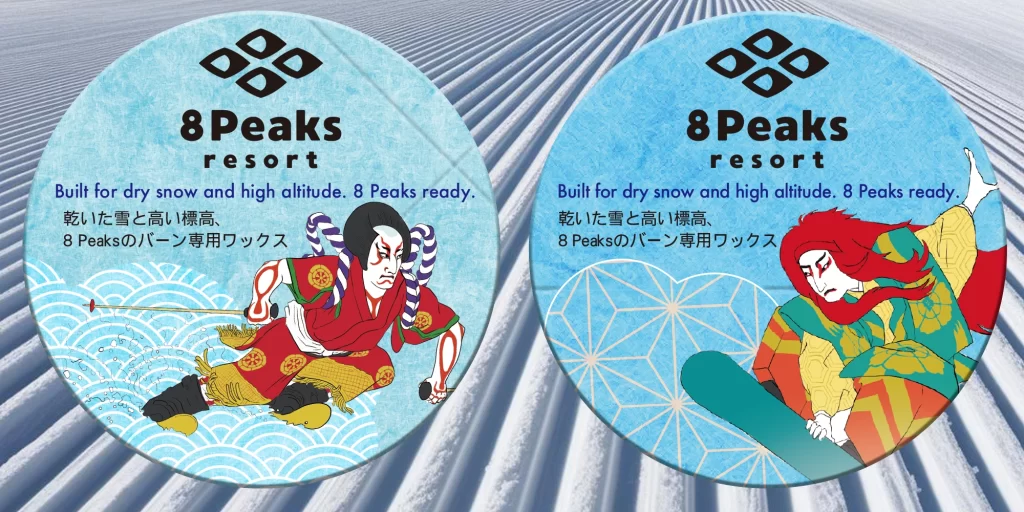 Two collectible designs featuring a kabuki actor — one on skis and one on a snowboard. A standout souvenir from Japan.