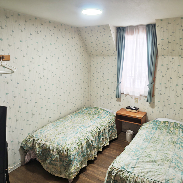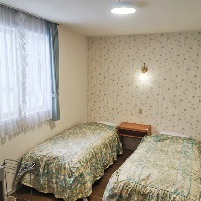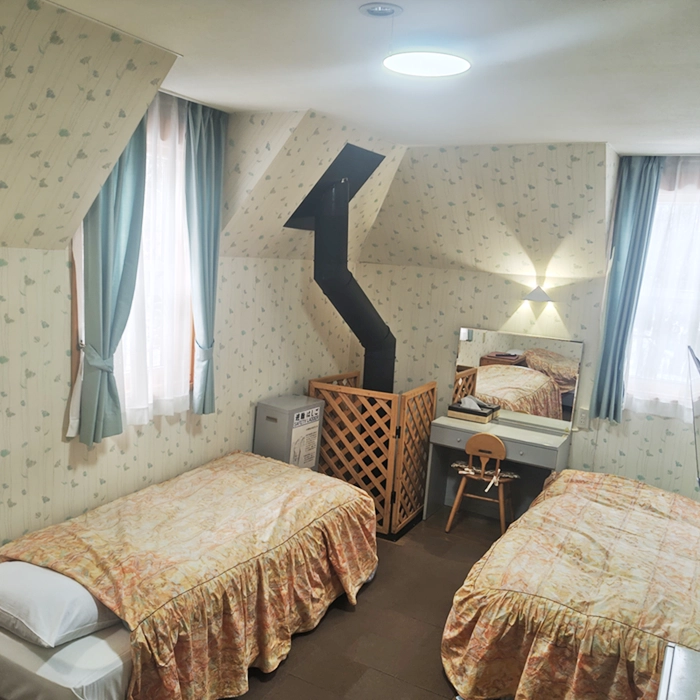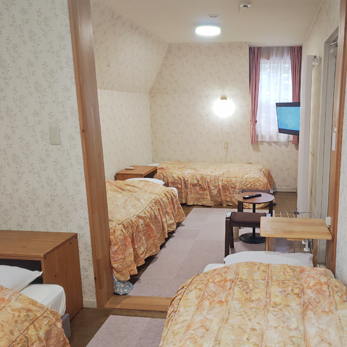 A family room that can accommodate up to four guests, with three single beds and one sofa bed.