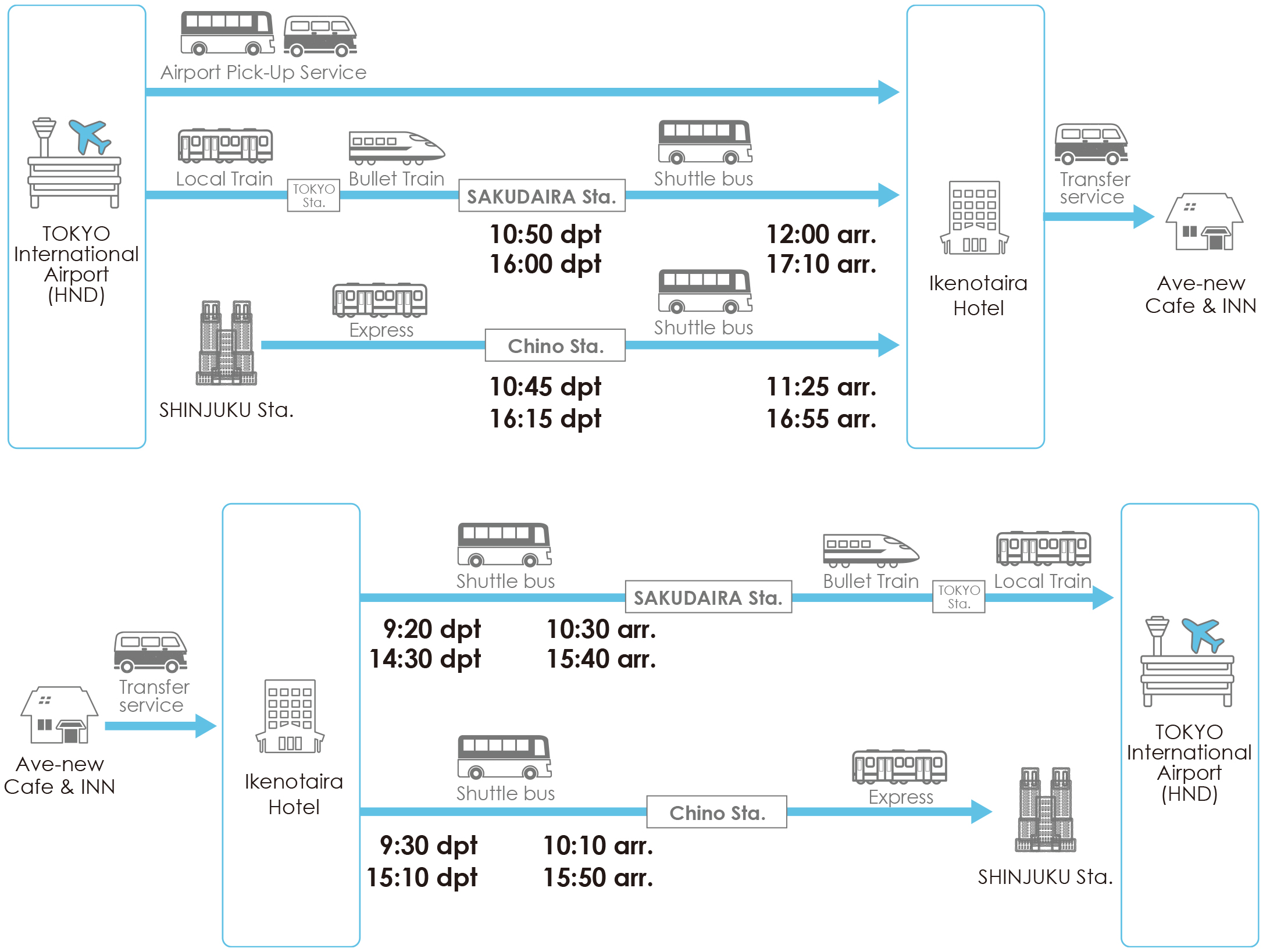 The shuttle bus from Sakudaira/Chino Station is free of charge, but advance reservation is required. Please make sure to arrive at the meeting point at least 15 minutes before departure for check-in.