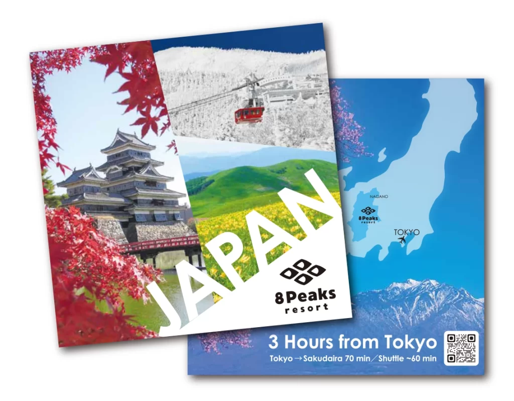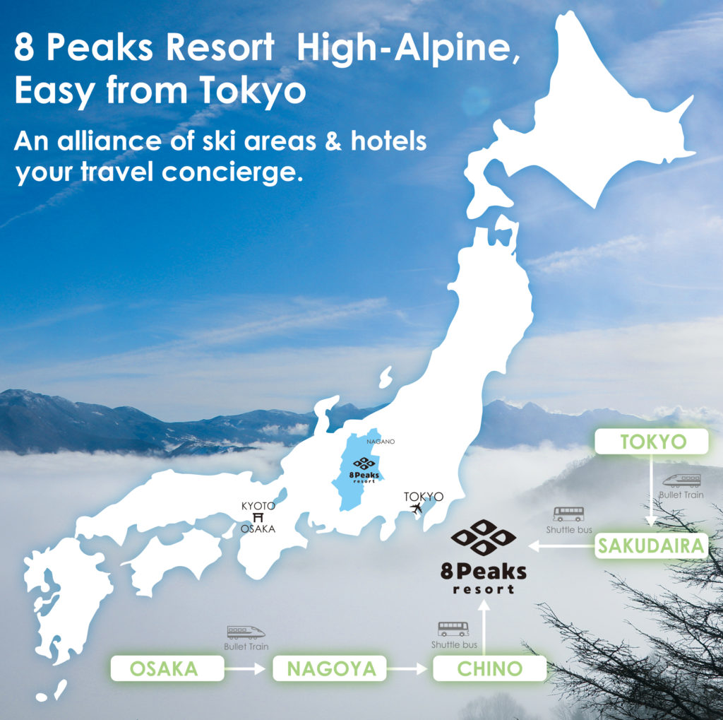 Set at 1,500 metres in Nagano, 8 Peaks Resort reveals Japan’s beauty in every season. From Tokyo, it’s about 3 hours in total—Shinkansen to Sakudaira (70 min), then roughly 60 min by shuttle. From this highland base you can even look down on a morning sea of clouds.