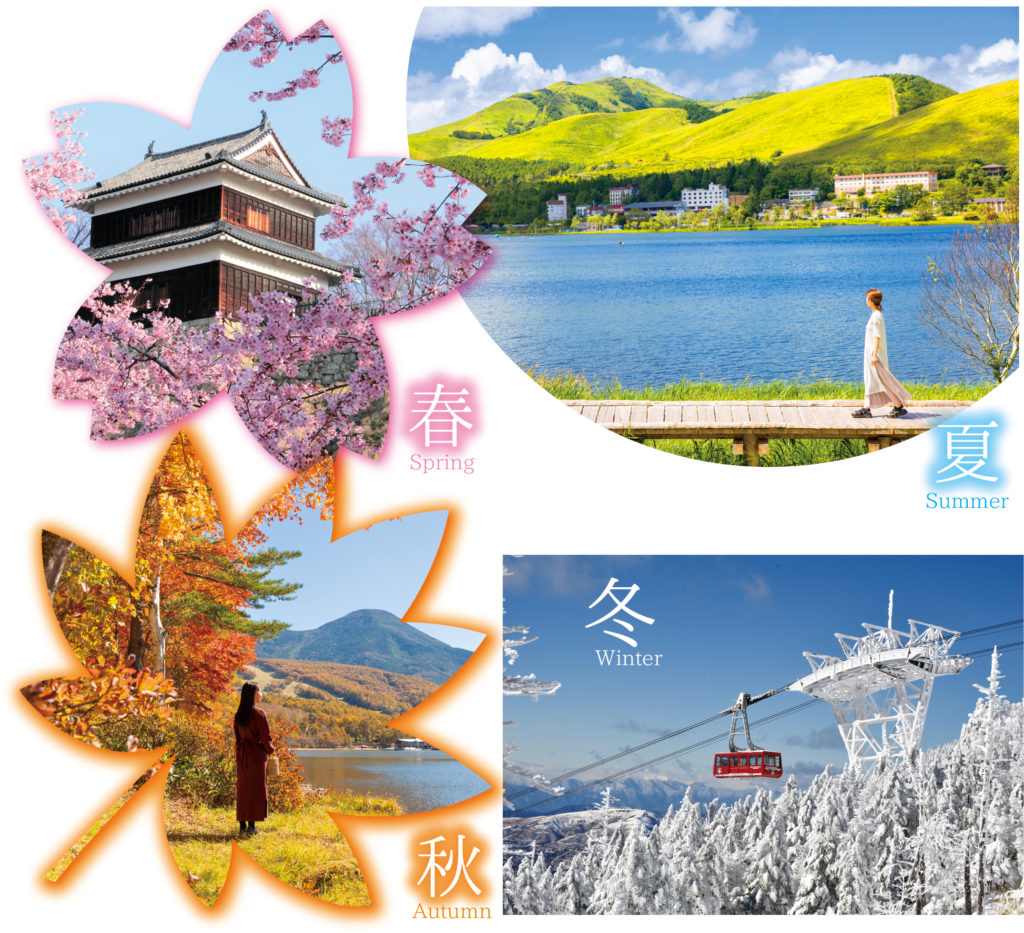 In spring, enjoy cherry-blossom viewing; in summer, gaze at vast mountain landscapes and lakes; in autumn, be captivated by brilliant red and gold leaves; and in winter, step into a silver-white world. At 1,500 m, the highland scenery changes beautifully with each season.