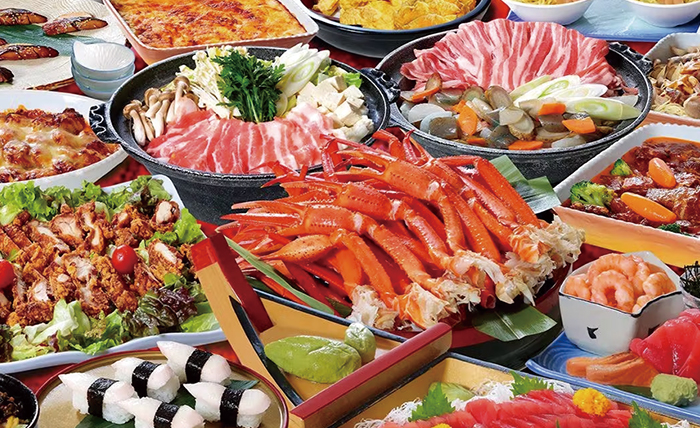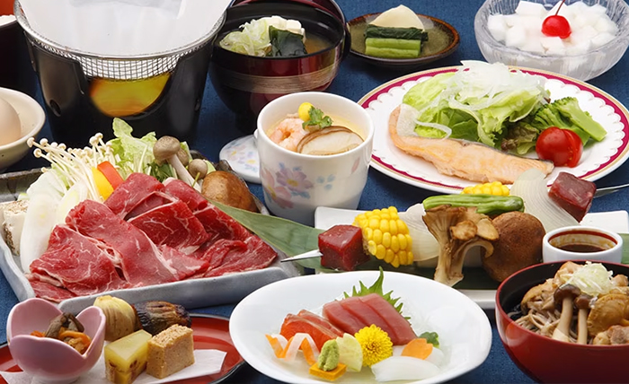 Our top recommendation. Shirakabakogen hotel Dinner is a buffet featuring 45 dishes, including anime‑style bone‑in meat, a matcha‑and‑chocolate checker cake and melonpan, plus street‑food favourites such as okonomiyaki, takoyaki and karaage. Dishes without pork, lard or alcohol are also available. In addition to the room type shown in the photo, traditional Japanese tatami rooms are also offered.